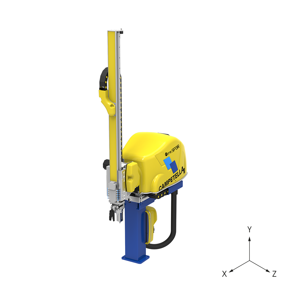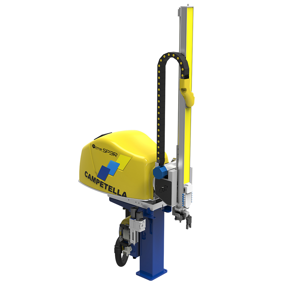 Řada SP3R PRIME je kartézsko-rotační sprue picker vyrobený z hliníkových profilů, doporučený pro vstřikovací lisy o tonáži od 20 do 300 tun. Jeho zvláštností jsou tři elektrické osy řízené servomotory – dvě lineární (X, Y) a jedna rotační (A) určená pro rotaci vertikální osy v celém rozsahu ±90°.