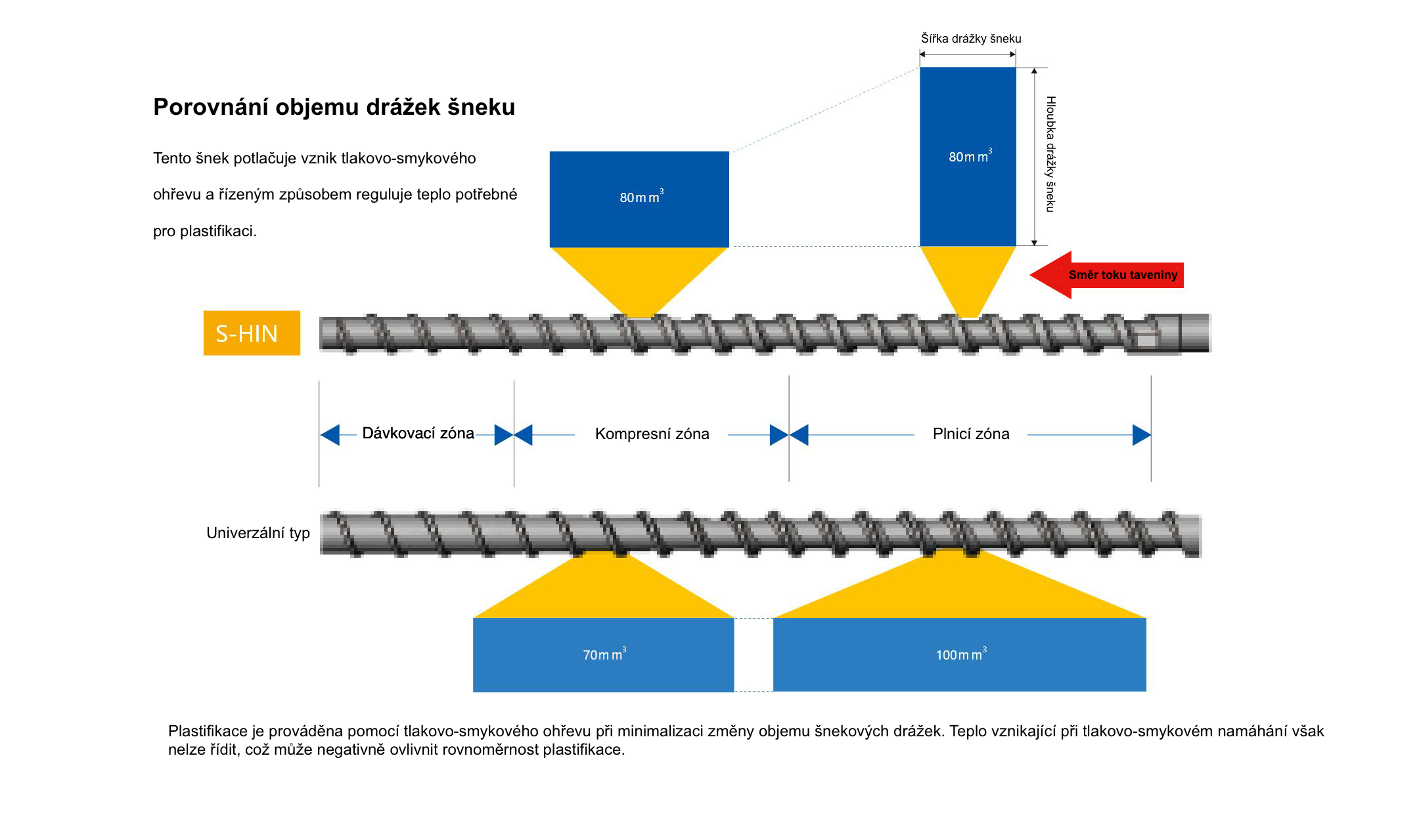 Šnek S-HIN byl vyvinut jako univerzálnější provedení vycházející z výkonových vlastností šneku SAG. Byla zvýšena schopnost plastifikace tak, aby bylo možné zpracovávat širší spektrum materiálů, přičemž je potlačen jev rozpadu (nestability během plastifikace) a současně je dosaženo stabilního plastifikačního procesu.