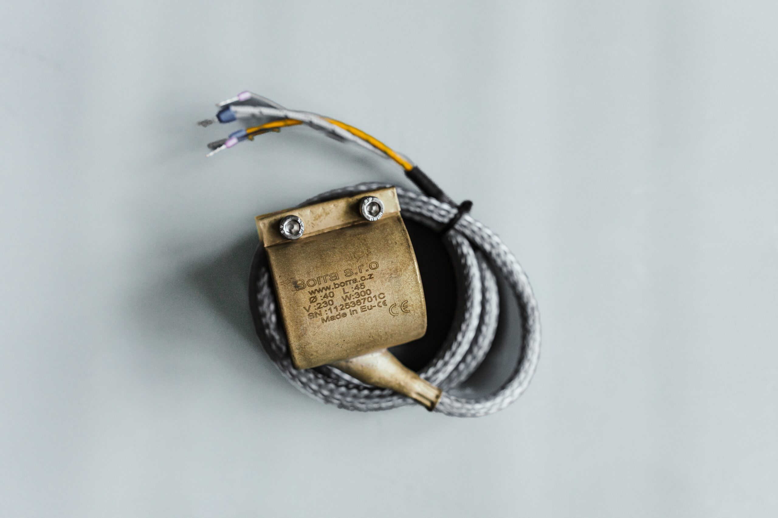 Třížilový opředený kabel, přístrojová zásuvka (dvoukolíková „remoska“), Eurozásuvka (tříkolíková), keramická svorkovnice v nerezovém domečku a další speciální vývody